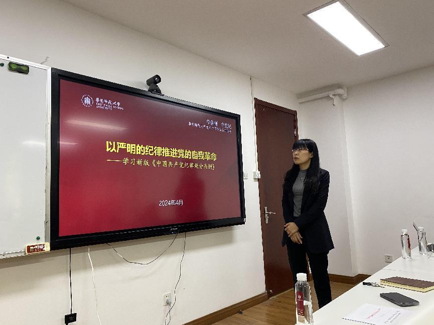 接着,王媛媛为师生作纪律党课,从《中国共产党纪律处分条例》的重要性、《条例》的修订历程、《条例》的框架结构和重要概念、新版《条例》增改重点解读等几个方面详细领学了《条例》,尤其结合警示案例就学院科研经费、仪器设备采购、举办会议、研究生招生、网络宣传等方面帮助与会师生加深对《条例》的理解。她强调,与会师生党员特别是党委委员,时刻要有纪律意识和规矩意识,要自觉遵守党章党规党纪,在接下来的党纪学习教育中注意发挥领学示范带头作用,把开展党纪学习教育与巩固拓展主题教育成果衔接起来,把党纪学习教育和全面从严治党、干部队伍建设、教师队伍建设、人才培养等各项事业有机融合,促进学院事业高质量发展。