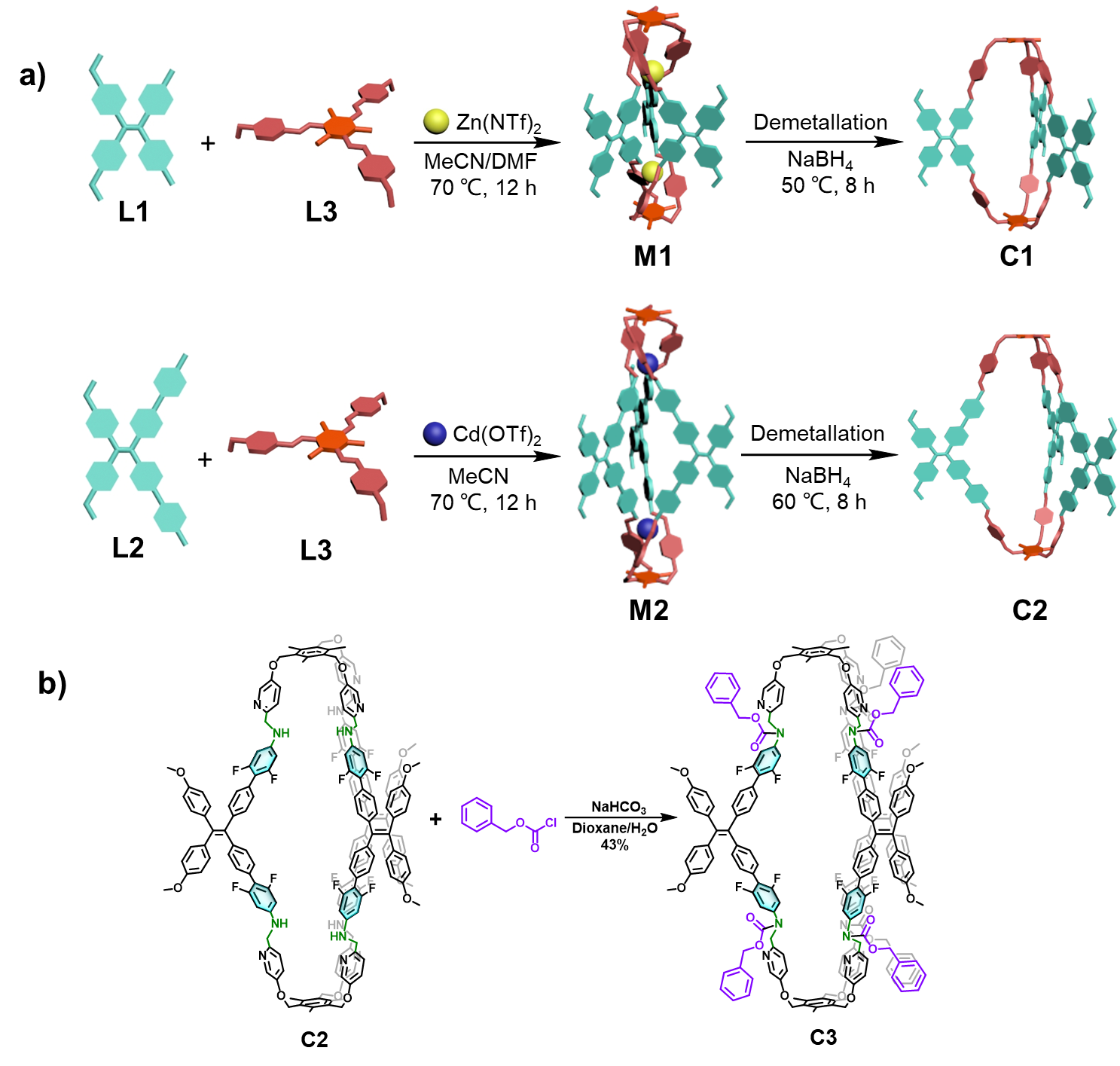 图1.共价有机笼C1、C2的合成(a)及其后修饰制备功能定制化的有机笼C3 (b)。