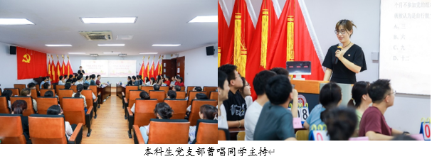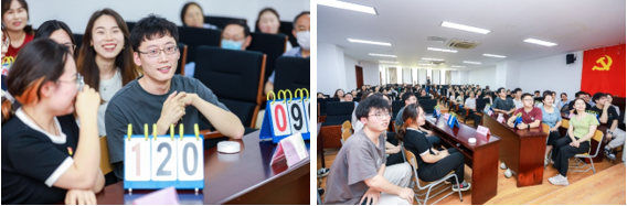 本次竞赛聚焦习近平新时代中国特色社会主义思想核心内容,由“党史知识必答题”、“党史知识抢答题”、“听红歌猜歌名”和“图说党史”四个环节组成。比赛一开始,现场气氛就热烈起来,第一环节中参与答题的队伍根据抽签选择的问题有条不紊地回答,展现了扎实的党史知识基础,旁观的队伍也聚精会神,边听边学。第一环节结束,各参赛队伍答题得分都接近满分,比分不相上下。在抢答环节,比赛迅速进入白热化状态,选手们利用团队间的默契配合你争我抢,比分差距逐渐拉开。在“听红歌猜歌名”环节,现场响起了一首首耳熟能详的红歌曲目,歌声或悠扬婉转或振奋人心,各参赛队伍竞相作答,比分交替领先,赛况紧张激烈,助推现场气氛达到高潮。在最后的“图说党史”环节,要求选手们根据图片内容说出相应历史事件、时间和意义,难度可谓直线上升,既检验选手的知识储备又考验了其临场反应的能力。在该轮比拼中不仅场上选手们尽显风采,还穿插了现场求助环节,台上台下形成了互动的良好竞赛氛围。