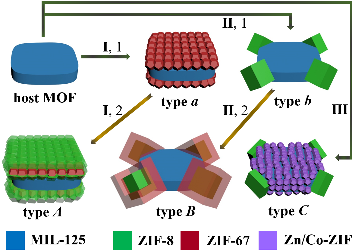 MOF是一类由金属离子或团簇和有机配体连接而成的多孔晶体材料,具有优异的物理化学性质,在吸附分离、传感、异相催化、能源转化及药物传递等众多领域备受瞩目。然而,具有单一结构与组分的MOF材料,由于其功能受到较大限制,无法满足实际应用领域多元化与功能集成化的需求。设计制备结构复杂可控的MOF基复合材料,有望将多种性质与功能有机结合,进而拓展其应用。当前研究策略大多采用将客体MOF材料均匀包覆于主体材料表面以形成核壳结构,该方法很难实现对MOF生长位点和空间分布的精准调控。由于缺乏多元MOF复合的有效策略,极大限制了MOF基复合材料的结构及功能多样性。