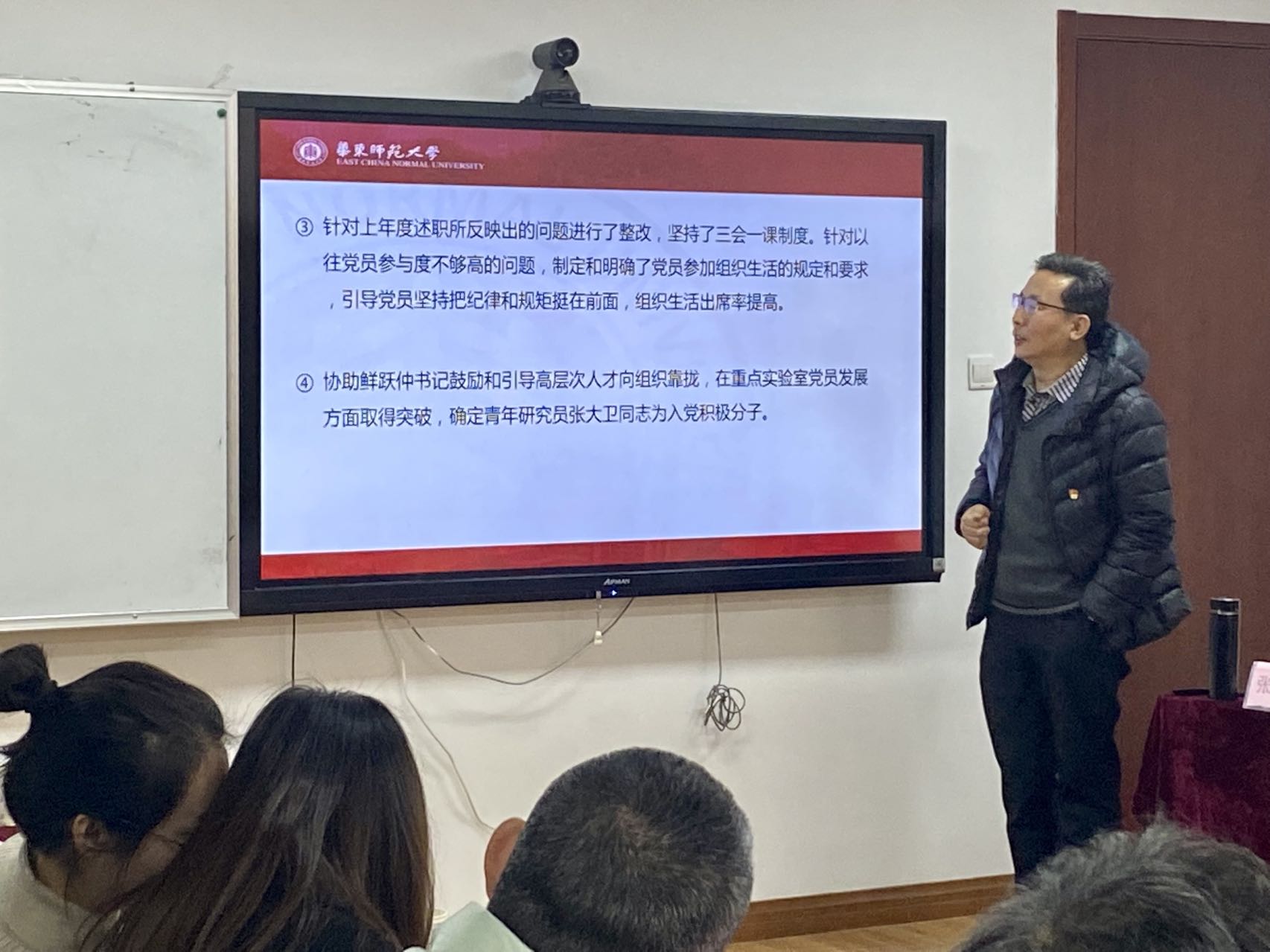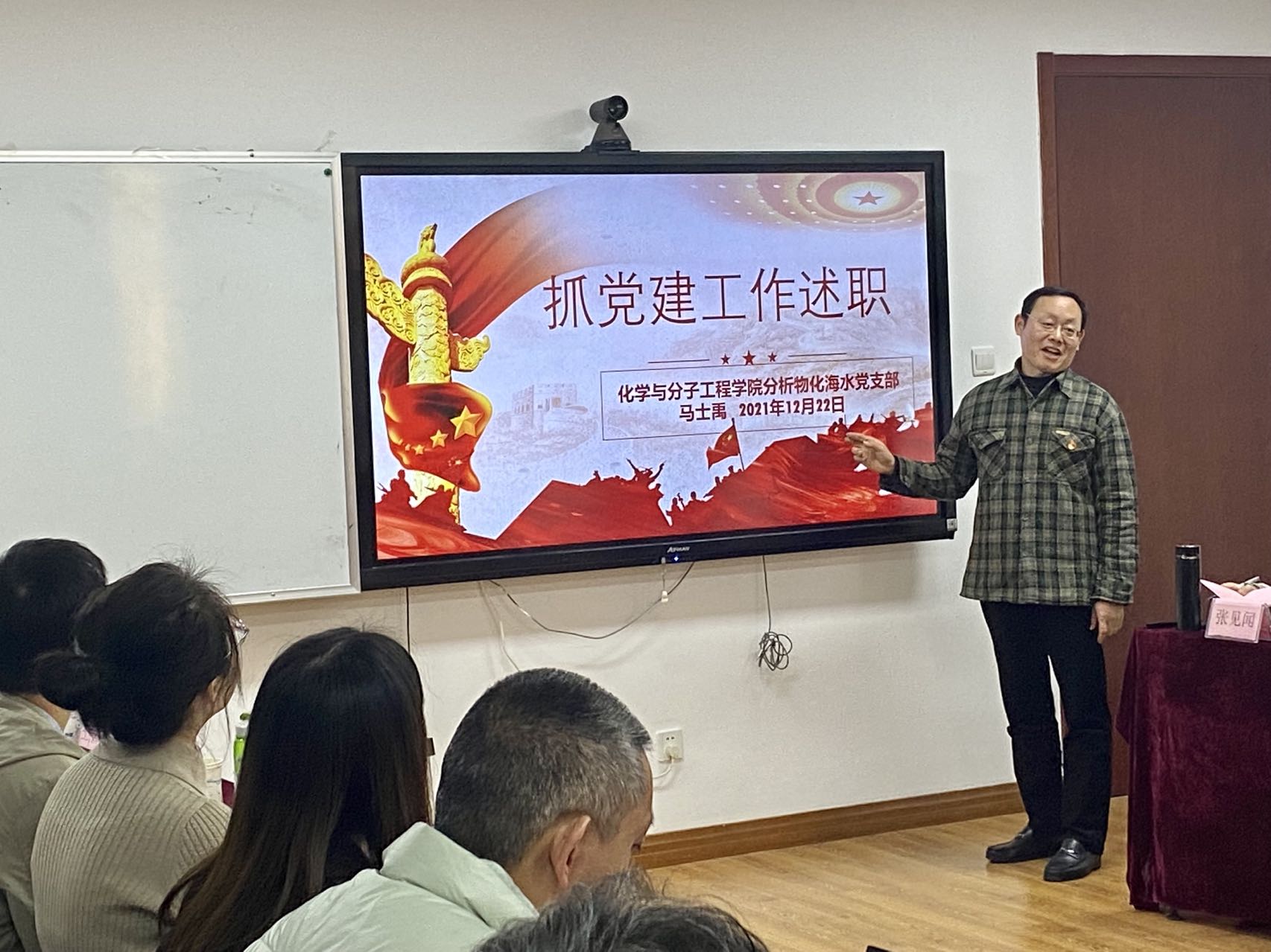 无机有机职工党支部书记孔爱国、高分子实验中心党支部书记黄琨、上海分子新药研究中心党支部书记张亮、分析物化海水党支部书记马士禹和上海绿色化学重点实验室党支部书记高恩庆在全面总结过去一年支部工作成果的基础上,深刻查摆了存在的问题并提出了下一步支部工作思路和想法。党委书记鲜跃仲、副书记王婷婷和党委委员谢美然、孔爱国、王媛媛分别对5位教工党支部书记抓党建工作情况进行了点评,肯定成绩、指出问题并对如何进一步抓实抓好党建工作提出中肯建议。鲜跃仲特别强调党建工作与学校学院事业发展深度融合的重要性,教师党支部要更有力地发挥党建凝心聚力作用,促进全院教师积极投身于新一轮学科建设、“十四五”规划实施以及双卓越方案推进等重要工作。