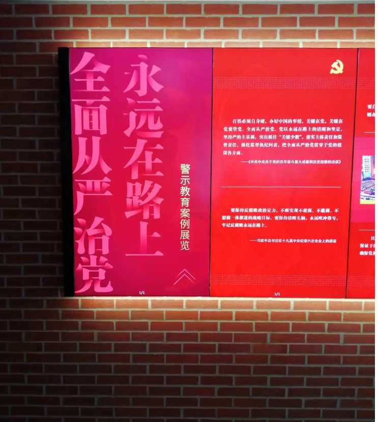 最后,参观了《全面从严治党 永远在路上》警示教育案例展,电子显示屏上,“一桌餐”“一个球”“一张券”“一份礼”“一辆车”“一种津补贴”“一个会所”“乱作为”“不作为”等12个主题、30个党的十八大以来中央纪委国家监委通报曝光的典型案例,警醒广大党员干部严于律己、防微杜渐。
