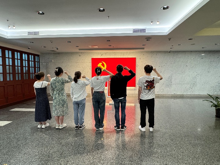 董雪同志分享到:“之前,因为疫情,我们只线上参观了中共一大会址,学习了一大精神。今天,我们终于有机会进行线下参观。工作人员介绍,2017年10月31日,习近平总书记同中央政治局常委在上海集体瞻仰中共一大会址,并在一大会址纪念馆宣誓厅面对党旗重温入党誓词。今天,我们作为中共正式党员,面对党旗,佩戴党员徽章,举起右拳,庄严宣誓。我们要继续发扬老一辈无产阶级革命家的光荣传统,求真务实,脚踏实地,坚定共产主义理想信念,继续朝着实现中华民族伟大复兴的宏伟目标奋勇前进。”
