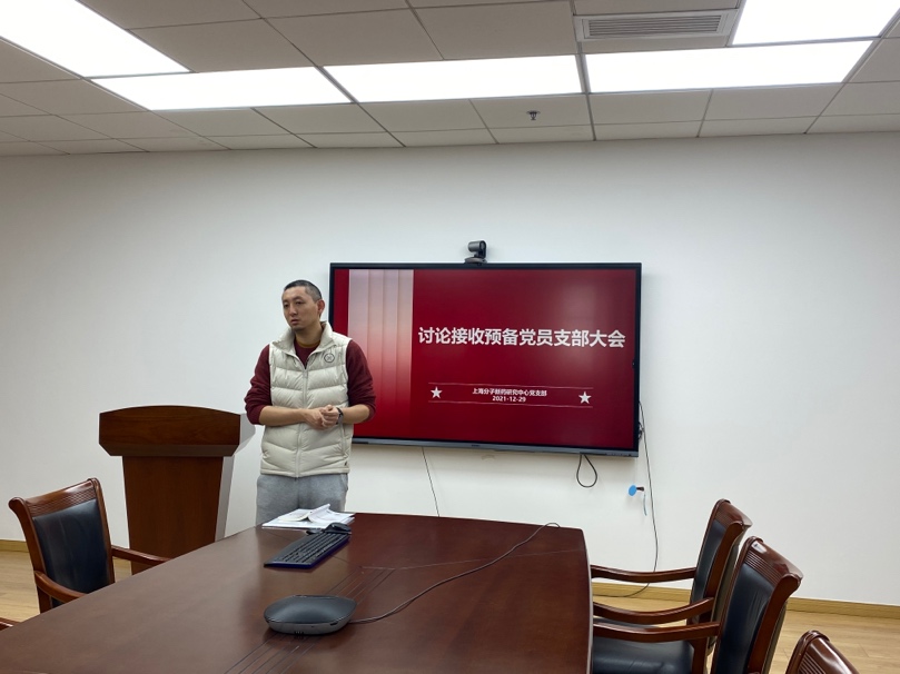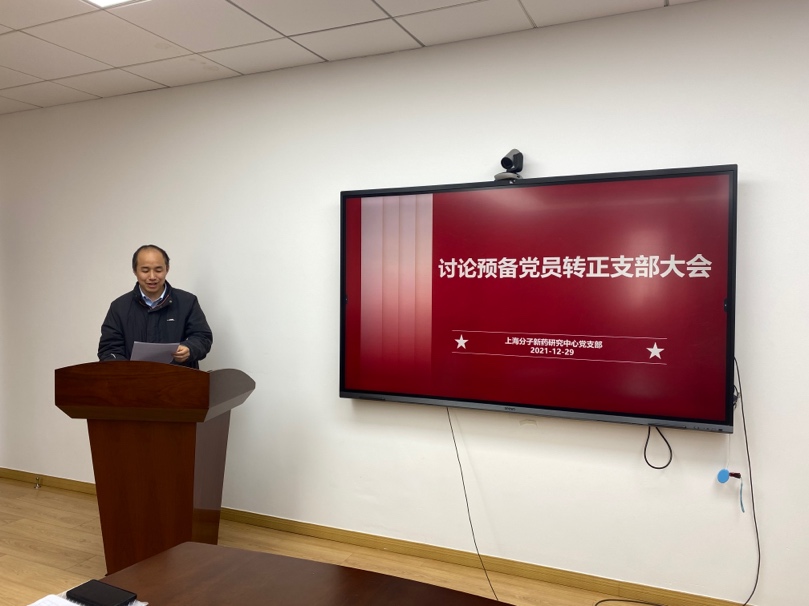 2021年12月29日,上海分子新药研究中心党支部在理科大楼B1602会议室召开支部大会,讨论接收预备党员和预备党员转正事宜。本次党员大会应到会具有表决权的正式党员26人,因事因病请假2人,实到会具有表决权的正式党员24人,有表决权的到会人数超过应到会有表决权人数的半数,符合程序规定。大会由支部书记张亮主持。