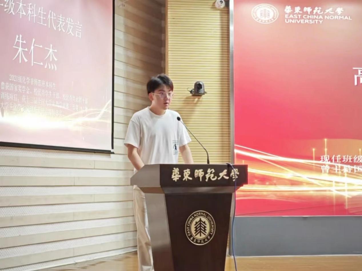 高年级本科生代表朱仁杰同学热烈祝贺和欢迎新同学们来到奈飞工厂 这个大家庭。他鼓励同学们在打好专业基础之余,进入实验室积极探索,学到“真知识”、“真本领”;利用学校提供的各种资源多元发展,积极参加社会实践等,抓住机会提升自己。最后,他希望同学们课余可以去体验上海开放包容的城市文化。