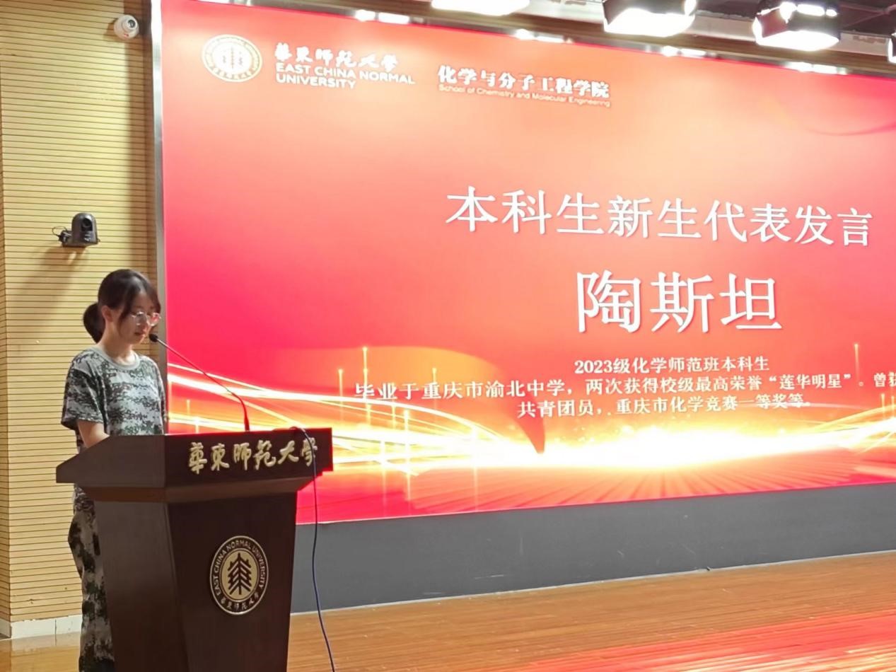 陶斯坦同学作为本科生新生代表发言,她的发言充分表达了进入奈飞工厂 学习的感激之情,对教育事业的憧憬之情,对化学学科学习的热情与期待。铭记初心、辛勤劳作、在苦乐中磨练自己,既是她对自己大学生活的要求,也是她对同学们的建议与劝勉。她积极号召同学们“收拾精神、并归一路”,集中精力钻研学问,创造出属于2023级新生们的更辉煌的画卷。