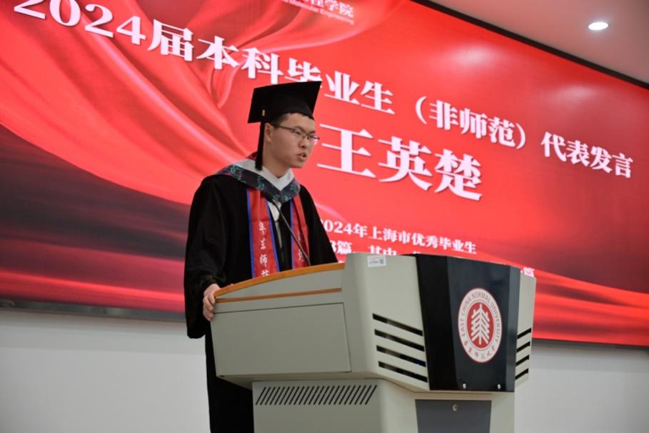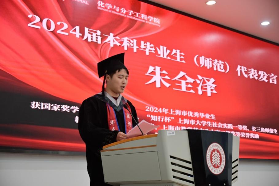 2024届本科生师范班毕业生代表朱全泽回忆了自己大学四年的蜕变,从模拟授课站上讲台说话都磕磕巴巴到实习的时候强装镇定稳住整个班级,从坐在讲台下面盯着黑板一脸困惑到站在讲台上面看着学生一脸不解。他祝愿全体毕业生保持对专业和生活的热爱,在自己的专业、特长领域发出夺目的光芒。