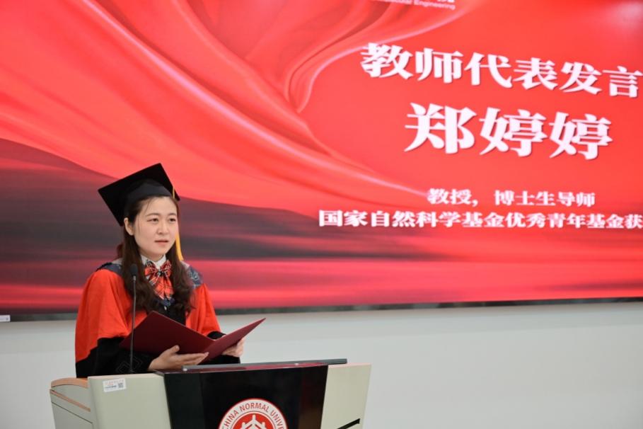 教师代表郑婷婷教授回忆了自己九年前入职时的场景,感慨九年间的院校变化和自身成长,并寄语毕业生要做一个有思想的人,面对挑战冷静地思考、理性地行动;要做一个有行动力的人,勇于承担国家赋予我们的时代使命;要做一个有责任担当的人,积极进取、不负青春;永远不要给自己设置天花板,积极思考,勇往直前,敢于担当,创造属于自己的未来。