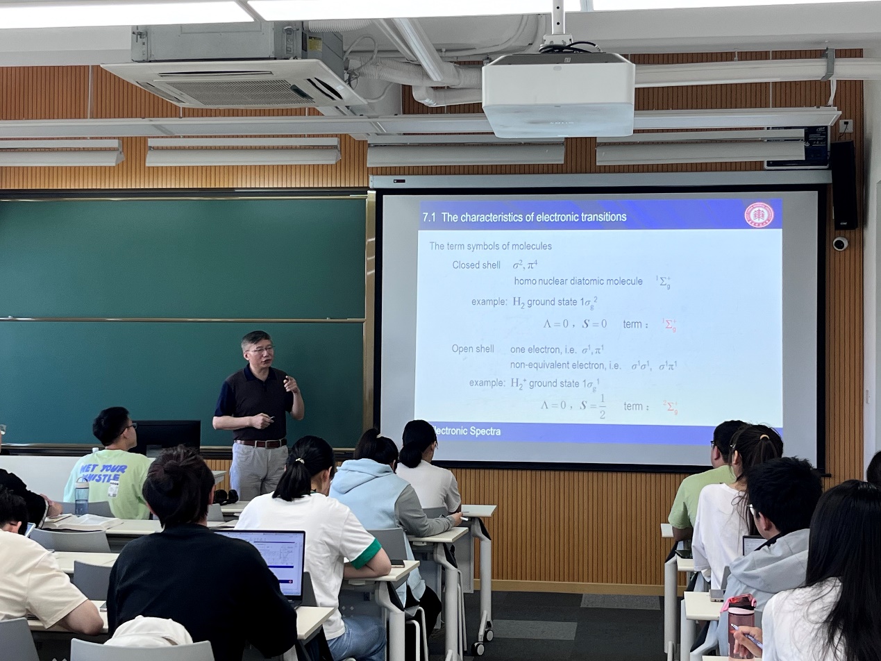 表的方式带领学生体味其数学上的美感。随后,他对电子光谱的基本特征、激发态的退激过程、激光的概念以及光电子能谱进行了介绍。在与前几节课讲授的原子光谱相衔接的同时,陈启明教授对电子的跃迁、分子光谱等知识点进行了重点阐述,并提出学习物质结构的目的是建立宏观表象和微观结构的联系。在讲解光谱项的时候,陈启明教授跳出教材的固定框架,对原子和分子轨道运动和自旋运动的角动量进行归纳总结。当引入激光的概念时,陈启明教授更是将激光与化学相结合,让学生们体会激光的产生机理及其在研究分子结构和分子动力学中的应用。课程最后,陈启明教授为同学们讲解了光电子能谱的原理及其应用,并提出光电子能谱在物质结构学习中具有重要意义。