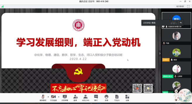 受疫情影响,此次入党积极分子联合党校培训班只能以线上会议的方式开展,但丝毫没有影响同学们的参与热情。在化学院党委与其他兄弟院系党委的通力合作下,此次开班仪式和培训讲座内容丰富、反响热烈。后续党校还将以专题讲座、视频观摩、小组讨论、线上考察参观等形式,介绍党在社会发展阶段的不同历史任务,帮助入党积极分子进一步端正入党动机,加深对党的基本认识,引导他们在思想行动上严格要求自己,为早日成为一名合格的共产党员打下坚实的基础。