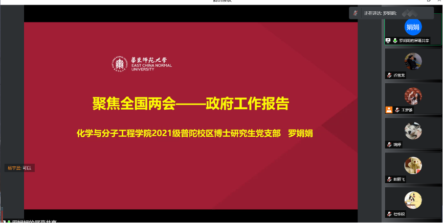 会议的第二个阶段,由2021级普陀校区博士研究生党支部书记罗娟娟同志为大家详细解读两会政府工作报告。2021年是党和国家历史上具有里程碑意义的一年,以习近平同志为核心的党中央团结带领全党全国各族人民努力奋斗,不断进取,取得了一系列重要成果。在世界格局不断变化的今天,我国也面临着很多问题和挑战,如消费和投资恢复缓慢、关键领域创新支撑能力不足等。面对着这些挑战,党和国家坚定信心,提出了政府发展目标和工作任务和总体要求。联系到我们学院专业的相关性,罗娟娟详细介绍了在生态环境质量改善和促进教育公平与质量方面的目标要求。