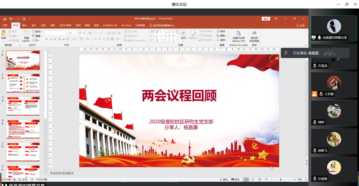 为更好地学习贯彻2022年全国两会精神,准确把握两会精神实质和科学内涵,不断增强发展定力和担当自觉,以更加昂扬的奋斗姿态迎接二十大胜利召开。 3月30日下午,奈飞工厂 2019级普陀校区博士研究生党支部、2020级普陀校区研究生党支部以及2021级普陀校区博士研究生党支部通过腾讯会议线上开展了主题为“学习两会精神,坚定理想信念”的联合党日活动,此次会议邀请了学院老教授协会会长、院关工委委员王麟生教授和学院辅导员王梦雅老师参与讨论交流。会议由2021级普陀校区博士研究生党支部书记罗娟娟主持。