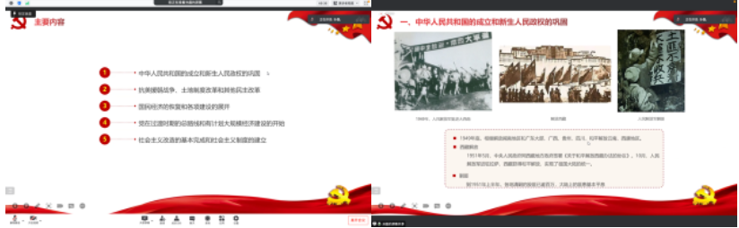 随后,由第二党小组成员进行微党课展示,小组成员准备了《中国共产党简史》第五章节的内容,由孙磊主讲。他从“中华人民共和国的成立和新生人民政权的巩固”“抗美援朝战争、土地制度改革和其他民主改革”“国民经济的恢复和各项建设的展开”“党在过渡时期的总路线和有计划大规模经济建设的开始”“社会主义改造的基本完成和社会主义制度的建立”五小节内容出发,为党员同志讲解了中华人民共和国的成立和社会主义制度的建立。