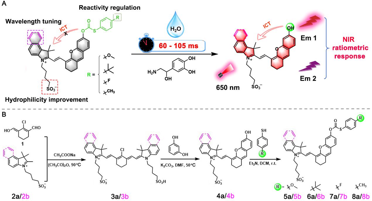 去甲肾上腺素(Norepinephrine,NE)是中枢神经和交感神经系统中关键的儿茶酚胺类神经递质之一,它能够通过快速动态的释放/结合过程介导神经元信号传递、情感调节和影响器官功能。NE水平的失衡与许多神经退行性和精神疾病密切相关,如阿尔茨海默病(AD)、帕金森病(PD)等。然而,由于生物体中NE含量与分布的动态性和瞬时性(ms-s),目前仍然缺乏有效的分子探针对其进行实时、快速、精准的动态监测和定量荧光分析。