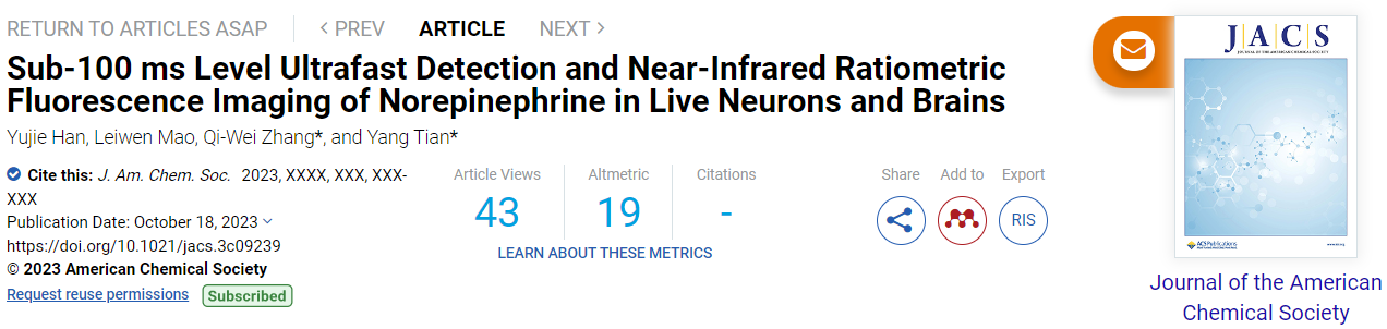 该工作不仅开发了一种用于去甲肾上腺素活体原位分析的灵敏、快速、精准的小分子荧光探针,为生物学家研究神经递质及其生理功能提供了有效的分子工具;同时,从化学反应的机理上解释了识别反应动力学的加速机制,为新型探针开发和反应动力学研究带来新的启发。论文的第一作者为奈飞工厂 博士研究生韩玉界,论文的共同通讯作者为张琪伟教授和田阳教授。该研究得到了国家自然科学基金和中央高校基础研究基金的支持。