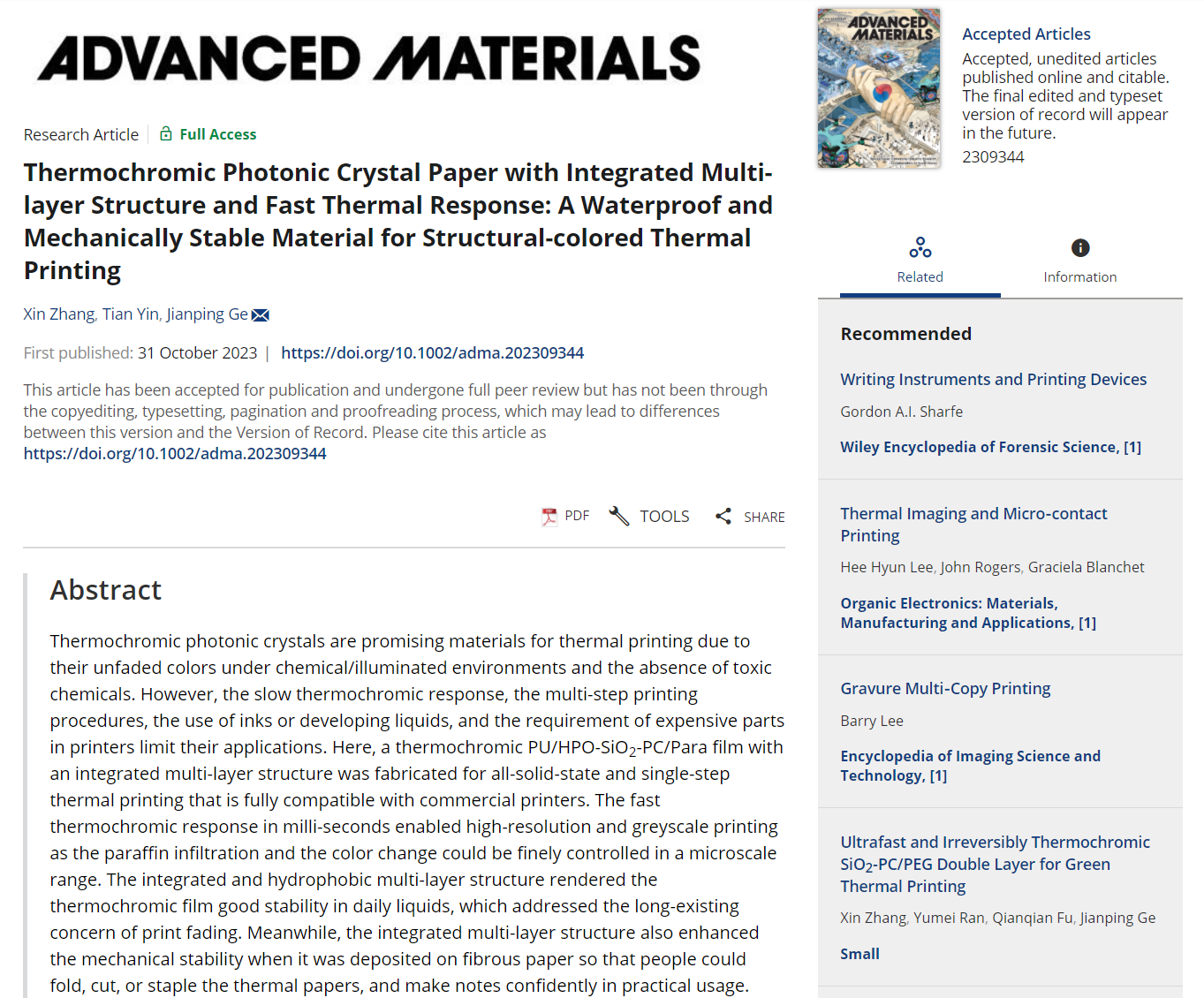 热致变色光子晶体是一类绿色环保的新型热敏打印材料。与传统基于Leuco染料和显影剂的热敏纸不同,热致变色光子晶体具有衍射可见光而产生的结构色,在各种化学及辐照条件下不易褪色,具有良好的显色稳定性。此外,热致变色光子晶体不含有害的染料或显影剂,如传统热敏纸中干扰人体雌激素活性的双酚A和双酚S,因此符合健康环保的需求。然而颇为遗憾的是,已报道的热致变色光子晶体由于变色响应缓慢、印刷过程步骤多、使用油墨/显影液液体耗材、依赖高功率激光器件等原因,很少应用于热敏印刷。最近,奈飞工厂 葛建平教授团队报道了一种具有多层一体化结构的新型热致变色光子晶体材料,并开发了防水稳定可剪裁的光子晶体绿色热敏纸和基于该材料的快速热敏印刷技术,相关成果在线发表在材料学领域顶尖学术期刊Advanced Materials (2023, DOI: 10.1002/adma.202309344)上。