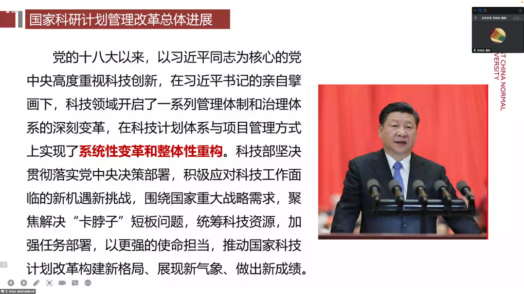 接着,科技处潘妍老师为大家介绍国家重点研发计划,讲解“十四五”重点改革举措,重点介绍了青年科学家项目、“揭榜挂帅”制度等的项目定位和特点等,对2021年项目申请情况进行总结,指出申报数创新高、经费总数创新高。此外,还对2022年项目申报情况进行讲解,梳理了申报流程和注意事项。