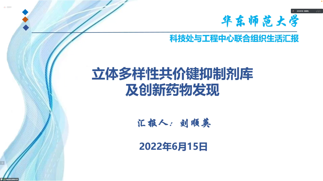 会议第三环节,由工程中心教师党员刘顺英老师介绍自己的相关工作,主要是立体多样性共价键抑制剂库及创新药物发现。刘老师从研究背景及关键科学问题入手,介绍了靶点开发困境,指出新结构活性工具分子对原创性新靶点发现至关重要,针对技术痛点指出急需开发高效特色化合物库。基于前期研究基础,刘老师提出解决方案是构建立体多样性共价键抑制剂库,并介绍了共价键抑制剂原理及引入共价键亲电弹头单元的优劣势。此外,刘老师还提出引入手性季碳建库的优势,指出立体多样性共价键抑制剂库有筛选效率高、高选择性等优势。从基础研究到应用基础研究再到应用研究,刘老师表达了自己努力做核心原创性药物发现的目标和愿望。