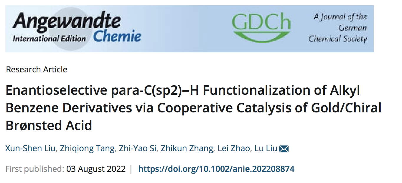相关成果以“Enantioselective para-C(sp2)−H Functionalization of Alkyl Benzene Derivatives via Cooperative Catalysis of Gold/Chiral Brønsted Acid”为题于2022年8月3日在线发表于Angewandte Chemie International Edition上 (DOI: 10.1002/anie.202208874)。刘迅绅博士为论文第一作者,刘路教授为论文通讯作者,唐智琼硕士、硕士生司志姚和本科生章智焜、赵蕾也参与此课题的研究。该项工作得到了国家自然基金科学委和上海市科委项目资助。