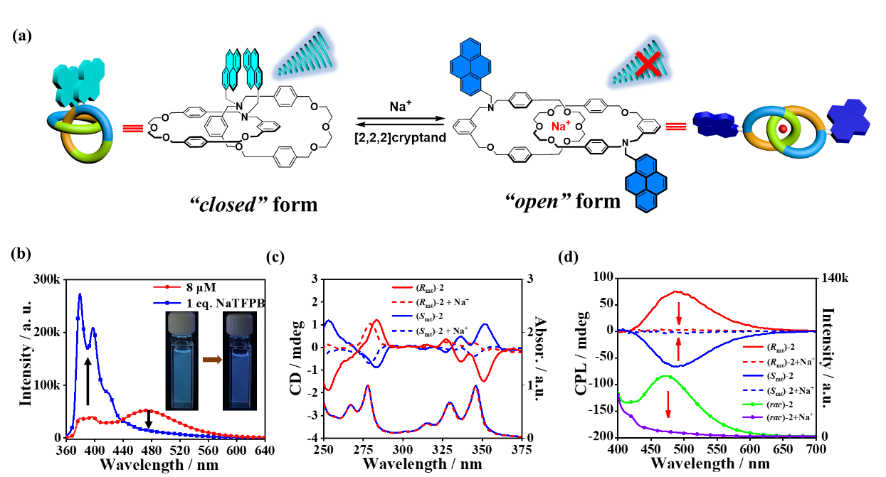 3. a)拓扑手性[2]索烃的共构象可逆转化示意图;(b)加入Na+刺激前后的荧光光谱;(c)加入Na+刺激前后的紫外吸收光谱和圆二色光谱;(d)加入Na+刺激前后的圆偏振发光光谱。图片来源:Angew. Chem. Int. Ed.