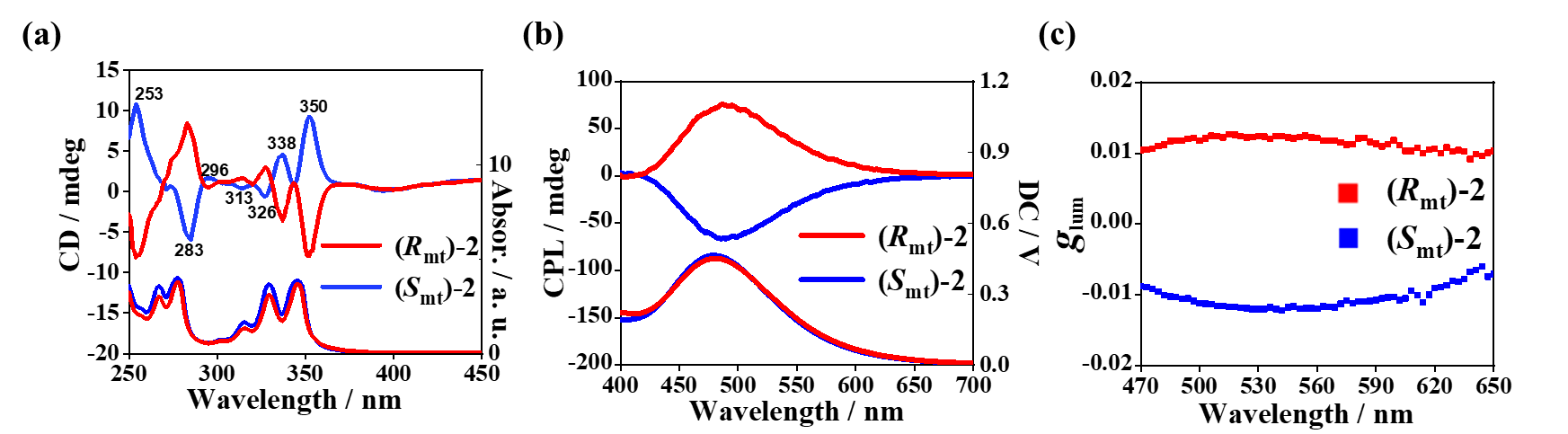 2. a)拓扑手性[2]索烃的紫外-可见吸收光谱和圆二色光谱;(b)拓扑手性[2]索烃的荧光和圆偏振发光光谱;(c)拓扑手性[2]索烃的不对称发光因子。图片来源:Angew. Chem. Int. Ed.