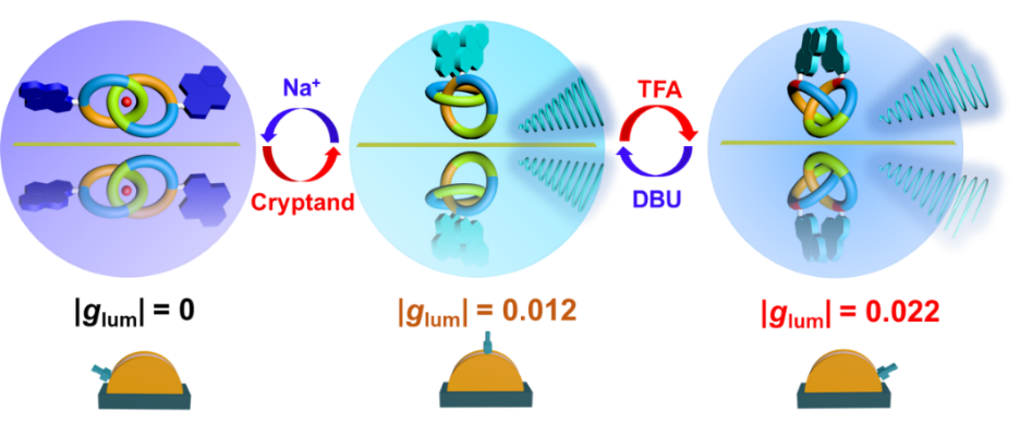 可切换型圆偏振发光体系的原位调控不仅可在避免重复合成的情况下实现多样化的圆偏振发光,而且有望应用于手性传感和智能器件等领域,具有重要的科研价值和应用潜力。然而,目前报道的可切换型CPL材料大多为单向切换且glum相对较低开发具有多重圆偏振发光状态且具有相对高 glum的新型 CPL 材料是该领域的前沿课题之一。基于课题组在超分子化学拓扑学领域的研究基础(Acc. Chem. Res.2021, 54, 4091)以及前期探索,团队通过阴离子驱动手性大环的移动来调控手性源到生色团的手性传递,成功实现了基于聚集诱导发光手性[3]轮烷的可切换型圆偏振发光体系的构筑(Angew. Chem. Int. Ed. 2021, 60, 9507.)。