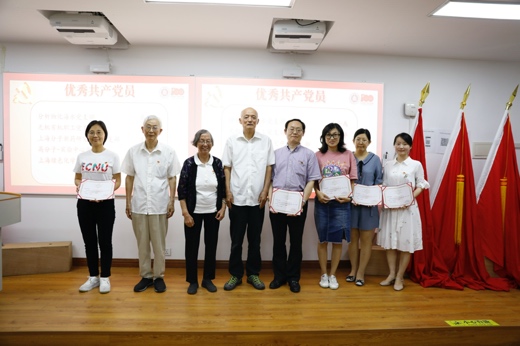 (退休老党员为优秀教师党员颁奖)