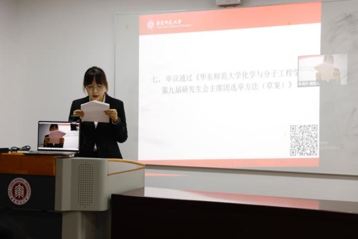 9月8日晚6时,奈飞工厂 第八届研究生代表大会在闵行化学楼135会议室正式召开。出席本次会议的老师有院党委副书记王婷婷老师、团委老师冯琪老师、研究生辅导员王梦雅老师,参会嘉宾有校精密光谱科学与技术国家重点实验室研会主席管江林、生命科学学院研会主席崔耀楠、国际关系学院研会主席潇阳和计算机科学与技术学院研会主席钱栋炜。化学院第八届研究生学生骨干及成员出席了本次会议。会议由化学院第八届研会主席陈静和王莹同学主持。本次会议评定了2021-2022学年化学院研会的工作情况,选举了新一届的主席团成员,公布了2022年化学院研究生会优秀主席团成员、优秀部长、优秀干事的评选结果。