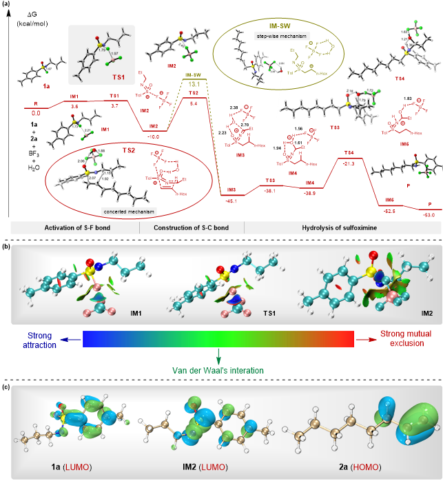 为了清晰描绘反应机理,作者开展了系列机制探究:氘代实验,表明反应过程涉及分子间氢迁移,且其过程可能是反应决速步;对照实验,发现氮α位存在供电子基团(如甲基)时,有利于氢迁移发生;硼谱与氟谱跟踪,发现三氟化硼加入氟代砜亚胺后11B和19F核磁发生了显著变化,印证三氟化硼对氟代砜亚胺活化启动了反应,再释放出亲电活性更高的砜亚胺阳离子。基于非共价相互作用(NCI)分析,三氟化硼的B对氟代砜亚胺的F具有强吸引力(B与F的距离从2.21 Å缩小至1.97 Å),并通过量子化学波函数(Multiwfn)观察到其氟化物LUMO轨道的分布从芳环扩展到硫原子,从而促进与烯烃HOMO轨道的有效重叠。DFT计算清晰表明反应是通过协同船式六元环过渡态(能垒为15.4 kcal/mol),而不是分步碳正离子过程(能垒为23.1 kcal/mol)。值得一提的是,体系中微量水的氢键作用既可促进S-C键构建,又可促进后续亚胺水解。