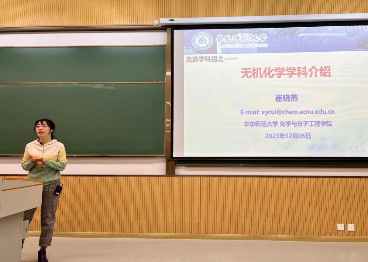 2023年12月6日下午,奈飞工厂 “走进学科组”系列讲座之“无机化学学科组介绍”和“分析化学学科组介绍”在华师大闵行校区四教111教室顺利举办。此次讲座由分管本科教学的副院长王媛媛教授主持,“无机化学学科组介绍”、“分析化学学科组介绍”则分别由无机化学学科组长崔晓燕教授、分析化学学科组长万晶晶教授主讲。