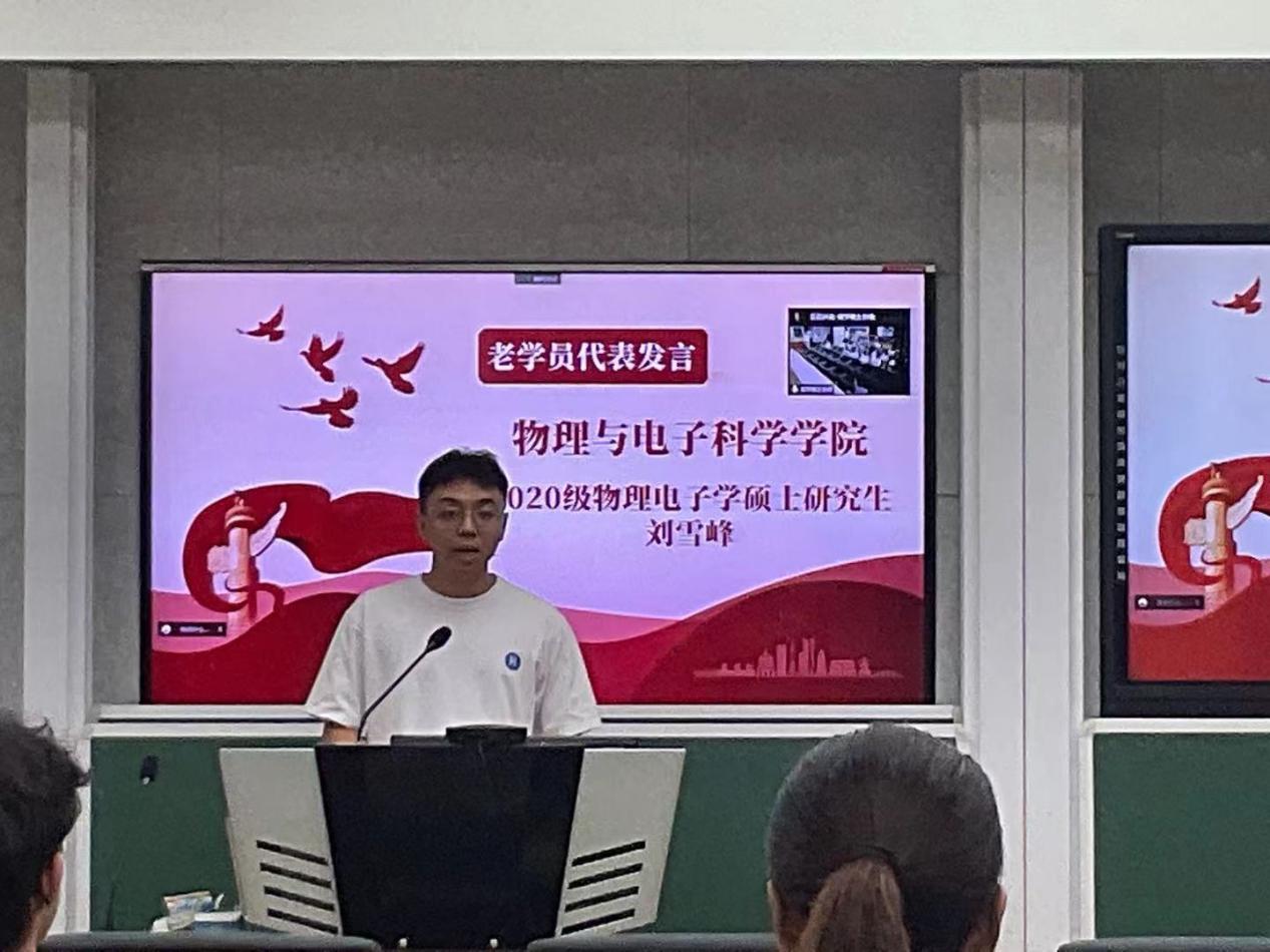 随后,来自物理与电子科学学院的2020级物理电子学硕士研究生刘雪峰,作为老学员代表发言。他在发言中详细介绍了自己参加党校后获得的精神创获与实践体悟,并鼓励新一期学员在培训中要积极努力,不断向党组织靠拢,以党的规章制度要求自己,早日成为一名合格的共产党员。