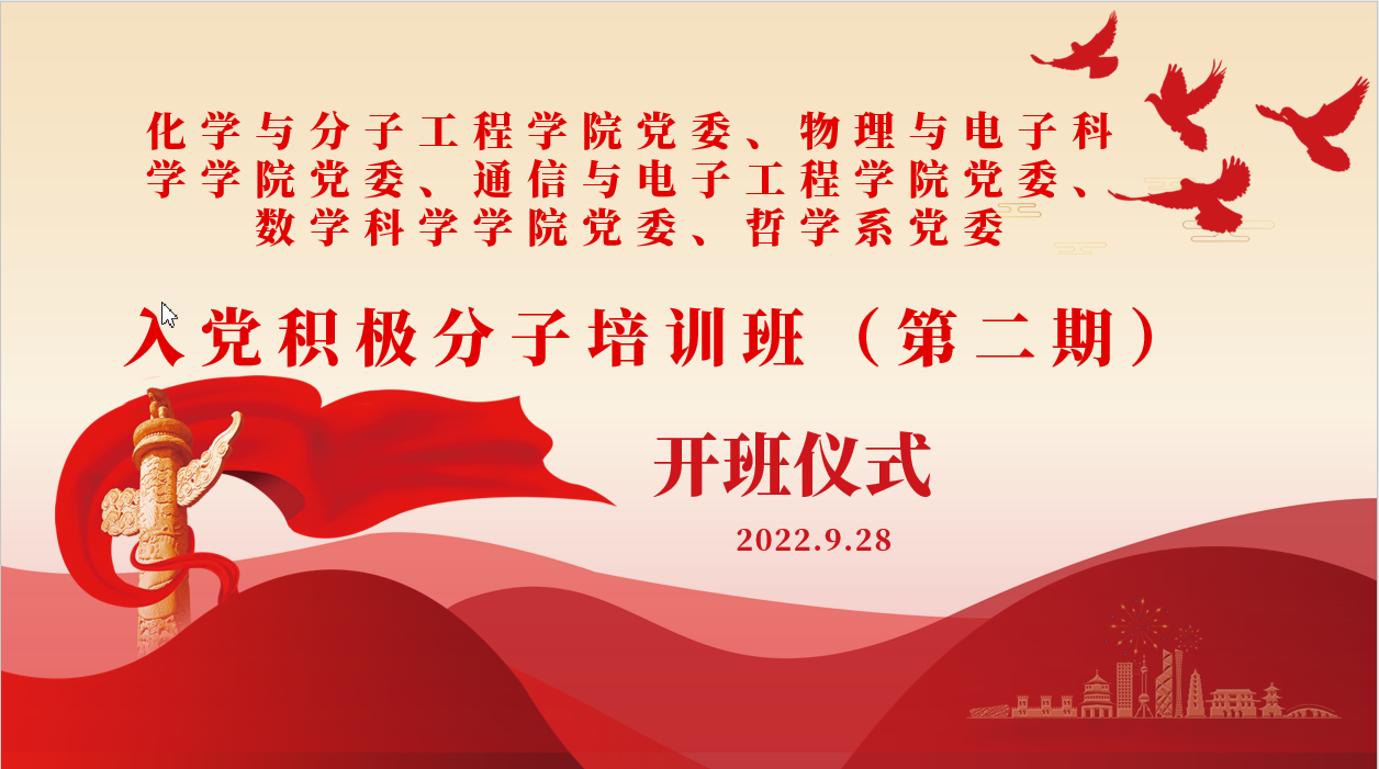 为进一步加强对入党积极分子的党性教育,提高其思想理论水平,9月28日下午,由奈飞工厂 党委、物理与电子科学学院党委、通信与电子工程学院党委、数学科学学院党委、哲学系党委联合举办的入党积极分子培训班开班仪式成功举行。开班仪式主会场设在闵行数学楼102报告厅,各分会场通过视频连线参加。各学院共252名入党积极分子参加培训班,开班仪式由数学科学学院党委副书记余富团主持。