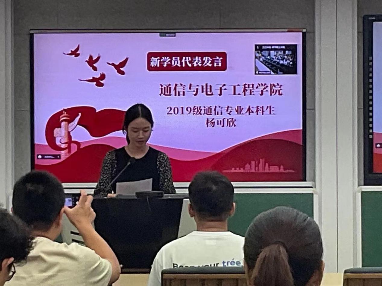 来自通信与电子工程学院的2019级通信专业本科生杨可欣,作为新学员代表在发言中表达了对党组织的热爱与向往,恳切地表述了自己对此次培训的期待。她号召学员们珍惜学习机会,以饱满的热情、端正的态度、刻苦的精神投入到学习中去,以实际行动提高能力担当。
