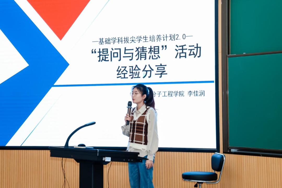 在闭幕式及颁奖典礼上,2021级化学拔尖班李佳润同学还分享了其参加“提问与猜想”活动经验。李佳润同学从活动目标、参与对象、学 科范围、赛事特点、比赛流程等维度对“提问与猜想”活动进行了细致讲解,她强调活动选题应具备前沿性、重要性和现实性,要通过设计问题分析去探索合适的研究方案,同时也不应忽视最后的成果展示环节,有力的说服性数据是重中之重,而专利、论文发表则是锦上添花。