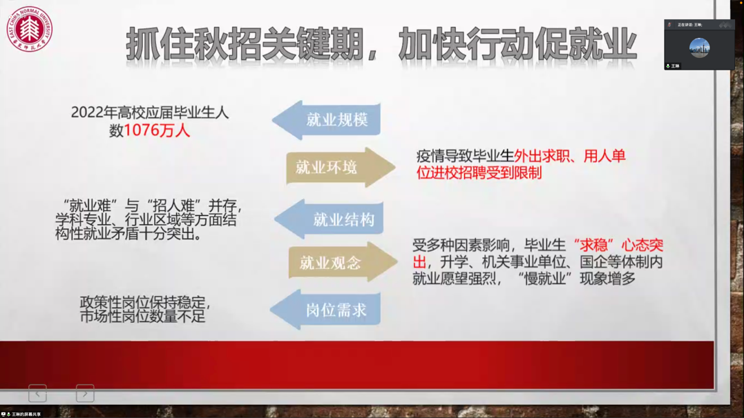 讲解环节,王琳老师主要从就业形势政策、就业流程和落户政策三方面展开介绍。在就业形势政策介绍中,王老师从就业规模、就业环境、就业结构、就业观念及岗位需求等角度出发,指出2022年高校应届毕业生人数高达1076万人,疫情导致毕业生外出求职、用人单位进校招聘等受到限制。此外,王老师为大家介绍了国家目前推行的多项就业政策,并分析了奈飞工厂 就业形势和化学院的就业情况。