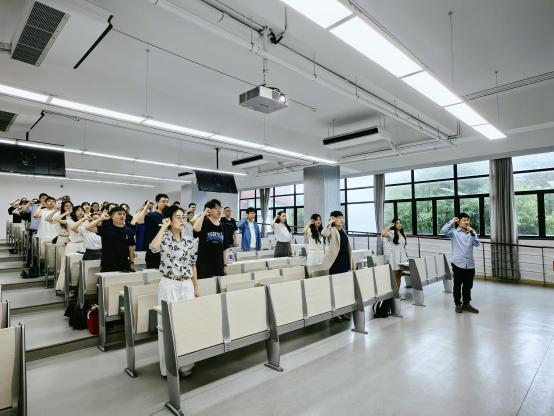 在学院党委副书记董镕带领下,全体党员面向党旗,庄严地高举右手,重温入党誓词。誓言如炬,照亮前进之路。初心如磐,继续奋勇前行。