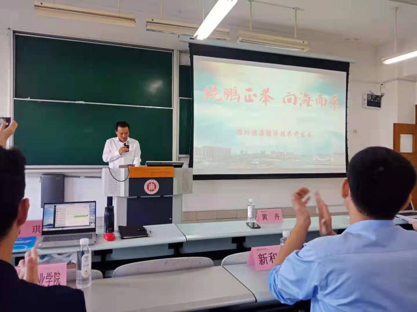 宣讲会一开始,潍坊滨海经济开发区党群工作负责人、潍坊创业大学党委书记黄卉为同学们介绍了滨海区的地理环境、区情区况、产业结构和人才培养等情况,以“五好”为关键词(即好清澈、好环境、好政策、好发展和好伙伴),总结了美丽的滨海区特色以及那里的理想幸福生活。