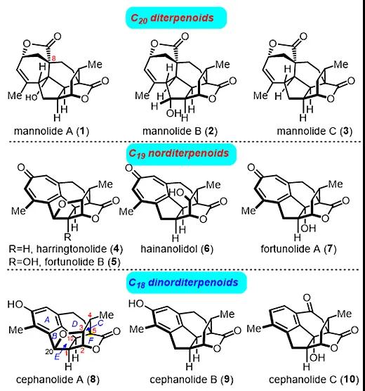 多环二萜作为一个结构多样的天然产物大家族,为药物研发和先导化合物的发现提供了丰富的来源。三尖杉属二萜(图1,1−10)因其独特的结构和潜在的生理活性而受到化学家与生物学家的广泛关注。Cephanolides A−C(8−10)是由岳建民课题组从粗榧(Cephalotaxus sinensis)中分离出的含有芳香苯环(A环)的C18降二萜(J. Nat. Prod., 2017, 80, 3159–3166),并提出了这一家族天然产物可能的生源合成路径:由GGPP经过多烯环化产生C20的cephalotane骨架(三尖杉属C20二萜,1−3);C19降二萜(4−7)是C20二萜经过脱羧及A环芳构化而来;C18降二萜(8−10)则是由C19降二萜进一步缩环/降解/芳构化等步骤产生。
