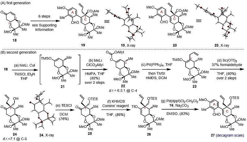 针对含有六个连续手性中心C环的选择性构建问题,作者发展了两代合成路线(图3)。从前手性化合物18出发,通过选择性Michael加成,脱羧烯丙基化、Lewis酸介导的aldol等反应得到含有四个连续手性中心的化合物24。并与A环片段发生Suzuki−Miyaura偶联反应得到化合物27。