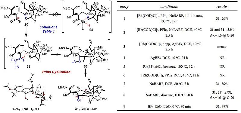针对多取代B环的构建,作者尝试了关键的分子内氢酰化反应尝试(表1)。通过大量的控制实验和背景反应研究,发现底物可以通过更为温和的分子内Prins环化反应实现关环。