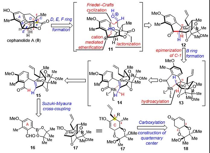 Cephanolide A是C18降二萜典型代表,含有复杂的六环结构,A−B−C三环为氢化芴醇结构,C环含有六个连续手性中心(C-5为全碳季碳中心),骨架中包含四氢呋喃E环和桥连内酯F环。基于此结构分析,合成工作集中解决以下挑战性问题:连续手性中心的立体选择性构建问题和笼状骨架结构的构建问题。