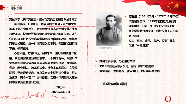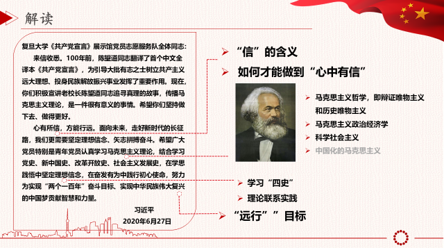 蒙超同志向大家详细介绍并解读了习近平给复旦大学《共产党宣言》展示馆党员志愿服务队全体队员的回信,期间详细介绍了陈望道老同志的生平事迹以及当时翻译首个中文全译本《共产党宣言》的艰难背景;结合自身情况,勉励大家学习陈望道同志坚定共产主义理想信念,弘扬马克思主义。深刻解读了习近平总书记在信中所讲到的“心有所信,方能远行”中的“信”的具体含义,即中国化的马克思主义;而如何做到心中有信则应深入学习马克思主义哲学、政治经济学、科学社会主义;同时深入学习党史、新中国史、改革开放史、社会主义发展史;而“远行”则是实现“两个一百年”奋斗目标和中华民族伟大复兴的中国梦。各党员认真听取并领会了回信当中总书记所传达的信息和寄望,联系了日常生活和工作情况,提高了党性与觉悟,坚定了共产主义信念。