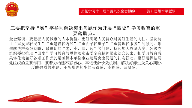 紧接着许彩云同志分三部分总结了在“四史”学习教育中深入学习贯彻十一届市委九次全会精神的要点。一是要充分认识“人民城市人民建,人民城市为人民”重要理念的深刻内涵和重大意义;在于深刻回答了城市建设发展依靠谁、为了谁的根本问题,深刻回答了建设什么样的城市、怎样建设城市的重大命题。