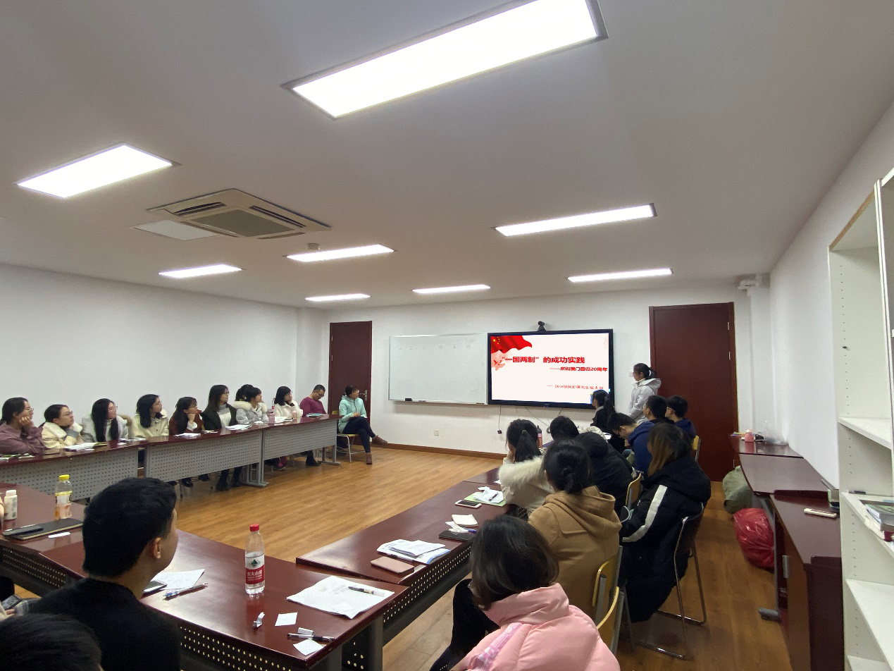 澳门的蓬勃发展与近期香港混乱的现状形成了鲜明对比。会上,就 “一国两制”基本国策下,澳门发展比香港更加稳定,香港可以从澳门的发展中借鉴哪些经验这一问题,支部成员展开了热烈的讨论。冯娟等同志从澳门与香港被殖民历史的差异以及普法教育开展的不同程度等方面阐述了澳门与香港之间的不同。同在殖民时期,葡萄牙对澳门的“去中国化”并不顺利;而香港 “殖民化” 时的价值取向使得香港年轻一代缺乏对祖国文化的认同。澳门特别行政区基本法的普及从娃娃抓起,重视普法通识教育;而香港的很多学校,缺少国民教育课程。