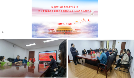 4月26日下午,分析-物化-海水党支部开展主题党日活动,就“学习贯彻习近平新时代中国特色社会主义思想”开展专题学习。支部书记马士禹老师主持会议。支部党员、党委书记鲜跃仲老师做主题报告,鲜老师对开展主题教育的对象、目的、意义、具体要求、根本任务以及习近平新时代中国特色社会主义思想的主要内容向支部党员做详细介绍,同时介绍学校和学院在开展主题教育方面的部署安排,最后就“支部如何开展主题教育”提出目标要求和具体的建议。通过主题报告,支部党员认识到深刻学习贯彻习近平新时代中国特色社会主义思想主题教育的重要意义,支部党员就“强国建设、教育何为?强国建设、我们何为?两个“先行先试”,我们何为?开展了交流讨论。支部党员、院长田阳,支部党员、副院长王媛媛,党员教师张鲁嘉、万晶晶等结合学院的发展和分管的工作谈了自己的思考和体会,支部党员表示在学习宣传贯彻习近平新时代中国特色社会主义思想主题教育的过程中要牢牢把握“学思想、强党性、重实践、建新功”的总要求,深学细悟笃行,以实际行动为“建教育强国”和“以教育强国”的光荣事业做出自己的贡献。
