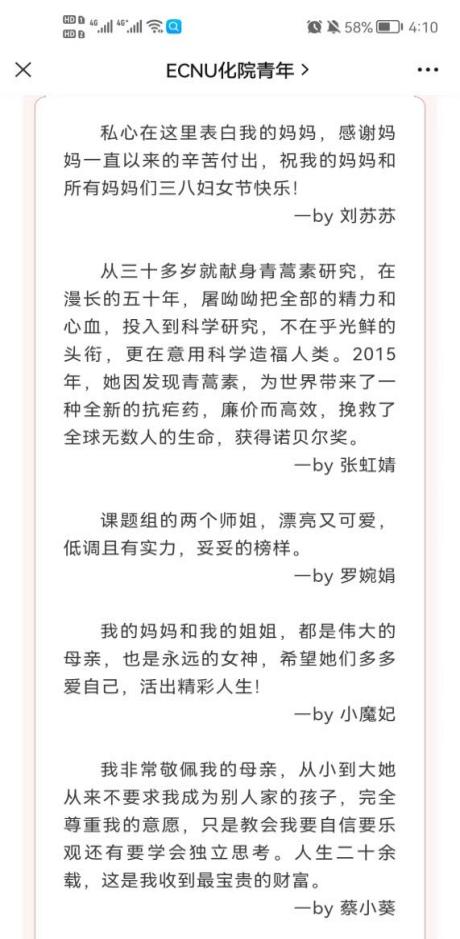 公众号的菜单栏分为:走进师大,春华秋实和更多资讯。其中走进师大栏目里下设四个子栏目:爱在华师大,化院掠影,化院简介和化院研会。新增的“春华秋实”版块整理了学院近期有代表性的学术科技工作,使同学们更方便地获取“一手情报”。另外通过两校区融媒体部的共同努力,公众号推文丰富了内容的色彩和布局,使得我们的推送封面、内容更加美观、统一,增加了阅读的趣味和美感。