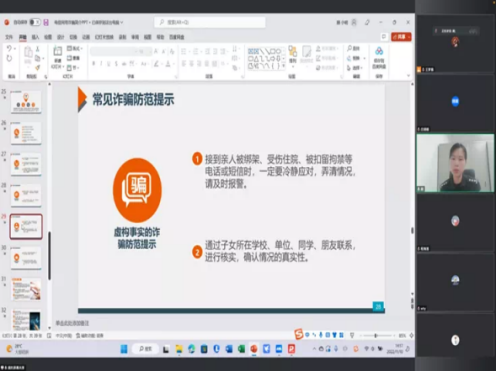 9月8日上午10点,校保卫处杨建老师以线上会议的形式,开展了2022级新生安全讲座。杨老师重点介绍了电信诈骗,以刷单、冒充好友借钱、冒充客服、网上买卖交易、约炮裸聊、网恋杀猪盘、网贷等具体形式提醒同学们注意防范。
