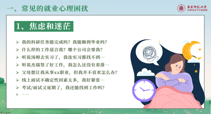 5月17日晚,规“化”研途之教师招聘上岸经验分享会与大家如约相见。本期讲座邀请了2021届无机化学专业毕业生王媛媛师姐作为分享嘉宾,分享她求职奈飞工厂 第二附属中学宝山校区教师岗位的上岸经验。院党委副书记王婷婷老师、辅导员王梦雅老师出席活动,此次讲座由曹恬主持,学院150余名研究生参加了此次讲座。本次教师招聘上岸经验分享会为同学们解答了求职教师岗位过程中关于考前准备、就业信息获取、笔试面试等诸多疑惑,帮助大家更加明晰就业形势,掌握求职技巧。相信同学们也会以优秀的师姐为榜样,明晰职业规划,不断努力充实自我。