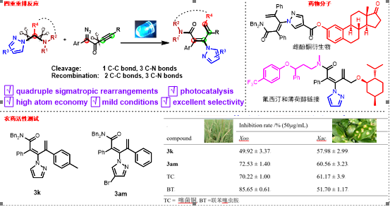 刘路教授团队长期致力于惰性σ键的精准激活与重组,基于“绿色碳科学”的理念,提出“可控串联重排”的概念。本研究利用炔基重氮酮和吡唑缩醛胺反应,在简单的光照下,依次发生了4次重排反应,实现了一次断裂4根σ键并生成5根σ键生成,为多取代共轭二烯化合物提供了模块化合成的方法。这类化合物对水稻白叶枯病菌(Xoo)和柑橘溃疡病菌(Xac)的杀菌效果和商业化农药相当。利用这个反应,可以很方便的对药物分子进行修饰,或者把几个药物分子快速对接起来,为新药开发提供了方法学基础。