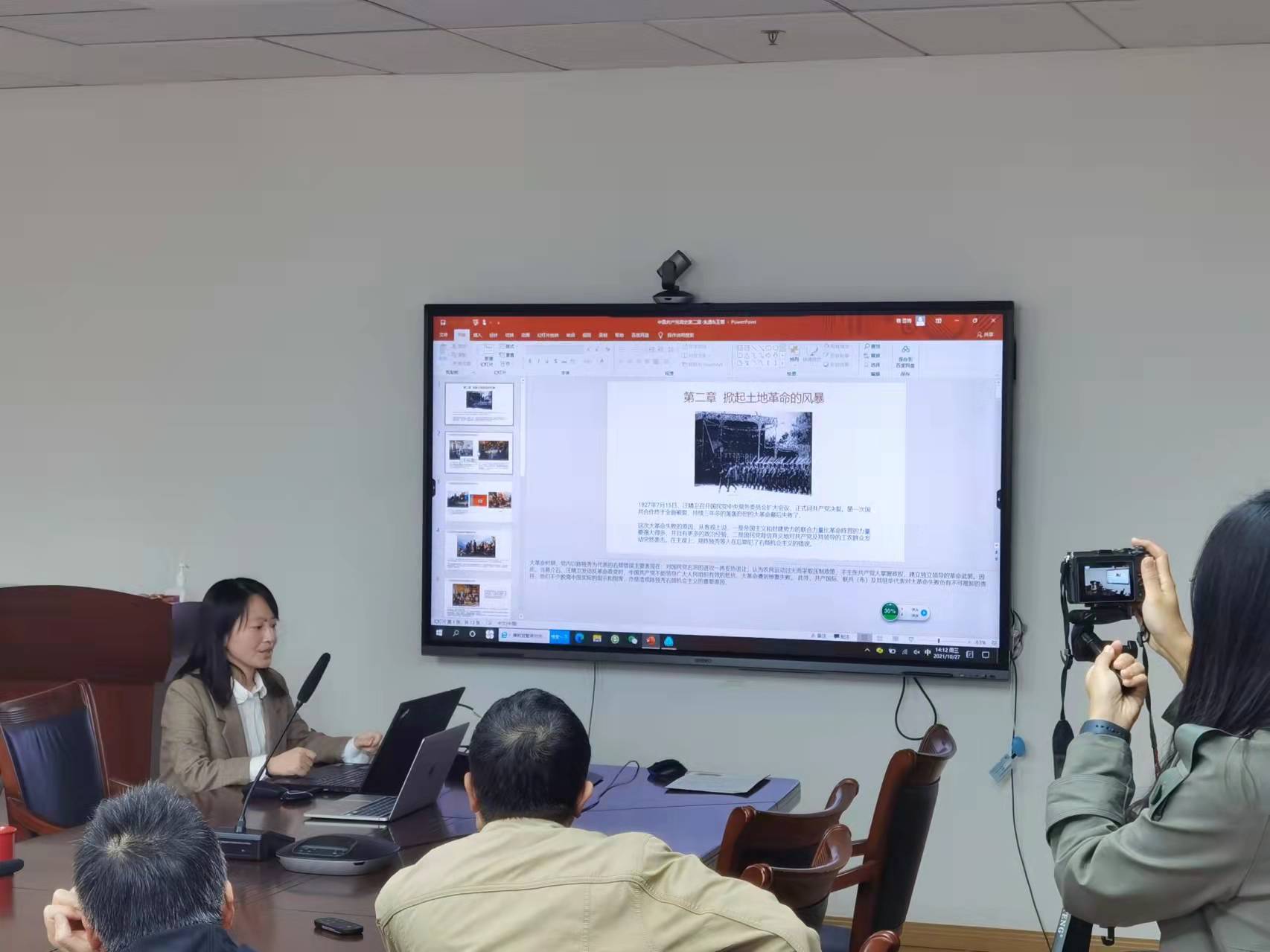最后,由第一党小组成员进行微党课展示,小组成员准备了《中国共产党简史》第二章节的内容,由王蕾主讲。王老师从“以武装斗争反抗国民党的反动统治”“毛泽东和中国革命新道路的开辟”“红军反围剿斗争的胜利和农村革命根据地的建设”“九一八事变后的局势和中央红军长征的开始”“遵义会议和长征胜利”“为建立抗日民族统一战线而斗争”六小节内容出发,为党员同志讲解了大革命失败后,面对反动派的血腥屠杀,中国共产党如何通过团结中国人民、调整内部路线及思想,从而最终实现全民抗战,对外部轻掠者奋起反抗的艰辛历程。